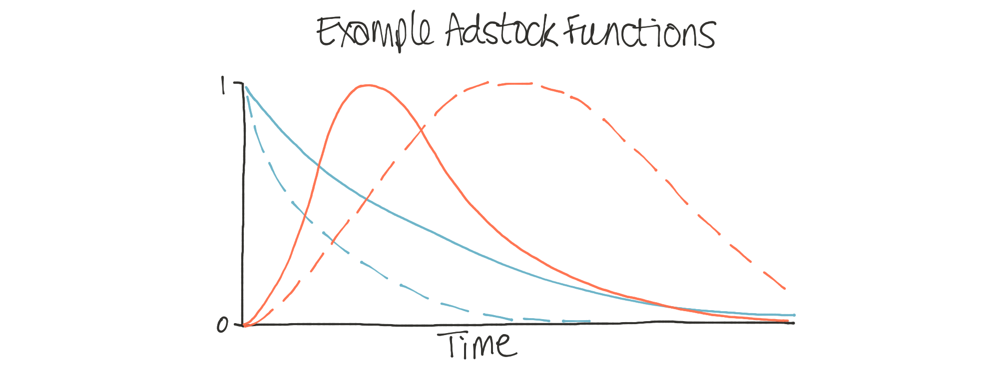 The marketing spend for a given channel may have a short-term effect or long-term impact. Remember that jingle from a TV ad you’ve seen 20 years ago? That’s a great long-term impact. The adstock function captures these time-course effects of different advertising channels. Knowing this is crucial - if we know some channels have short-term effects that quickly decay over time, we could plan to do more frequent marketing. But suppose another channel has a long, drawn-out impact on driving customer acquisitions. In that case, it may be more effective to use that channel more infrequently.
