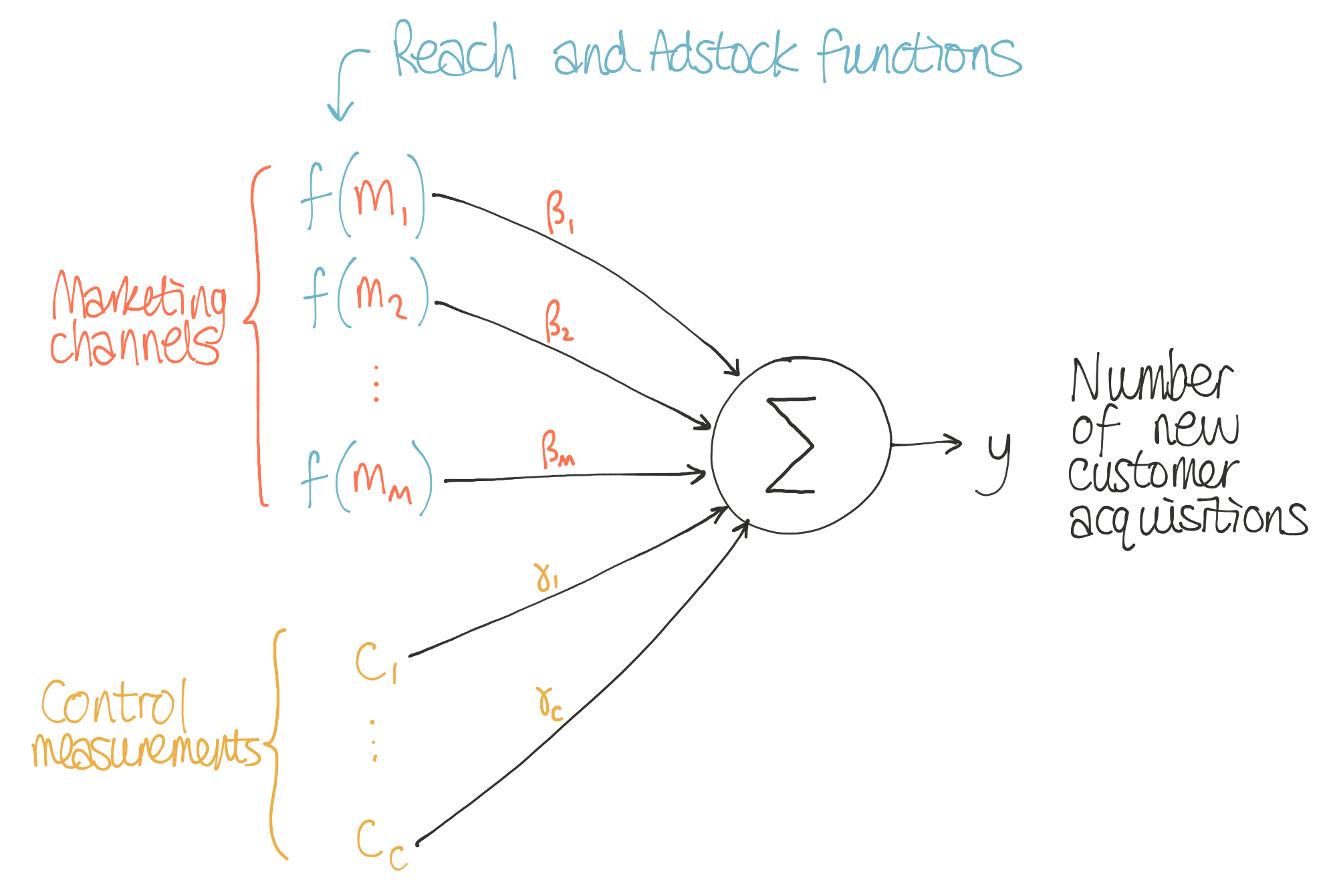 In simple terms, we can understand MMMs as regression modeling applied to business data. The goal is to estimate the impact of marketing activities and other drivers on a metric of interest, such as the number of new customers per week.